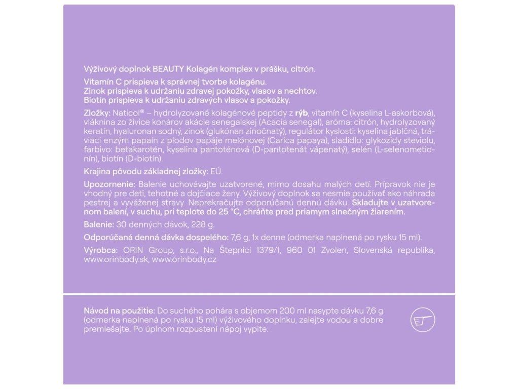 Klinickou štúdiou overená dávka kvalitného morského kolagénu Naticol®, ktorý má výbornú vstrebateľnosť a preukázaný, klinickými štúdiami overený efekt pleť, plasy a vlasy - na spomalenie starnutia, redukciu vrások, zlepšenie hydratácie, pevnosti, pružnosti a jasu pokožky.
