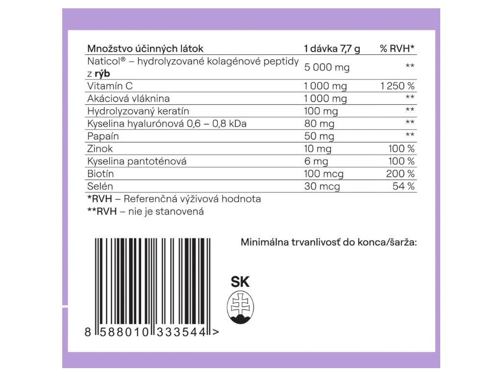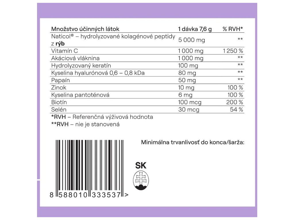- 5 000 mg rybieho kolagénu Naticol® s účinkami overenými klinickými štúdiami
