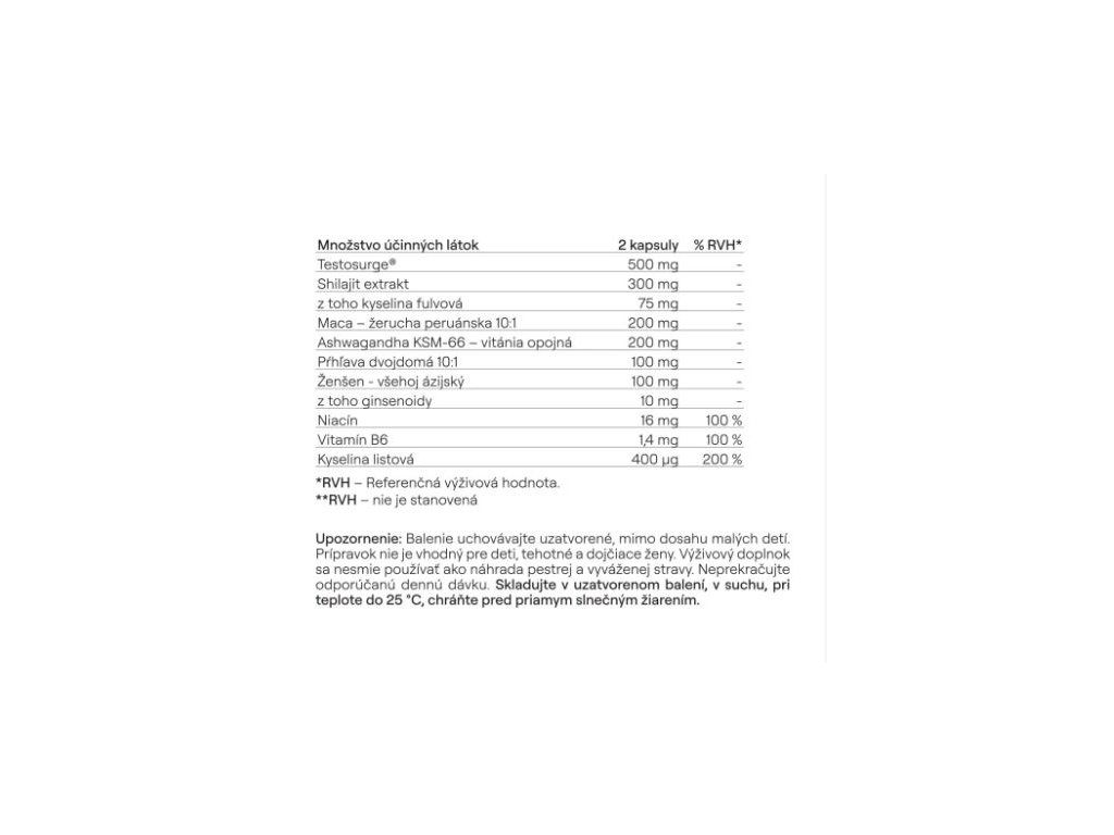 Zloženie: Testosurge ® - extrakt zo semien Senovky gréckej (Trigonella foenum - graceum), Shilajit extrakt (Asphaltum) s kyselinou fulvovou, kapsula: hydroxypropylmetylcelulóza, extrakt z koreňa Žeruchy peruánskej - Maca (Lepi-dium meyenii), Ashwagandha KSM - 66 - extrakt z koreňa Withanie opojnej (Withania somnifera), extrakt z listov Pŕhľavy dvojdomej (Urtica dioica), extrakt z listov Všehoja ázijského - Žeňšen (Panax ginseng) s obsahom ginsenoidov, protihrudkuiúca látka: stearan horečnatý, objemové činidlo: mikrokryštalická celulóza, niacín (inozitol hexanikotinát), vitamín B6 (pyridoxal - 5'- fosfát), kyselina listová (L - metylfolát vápenatý).