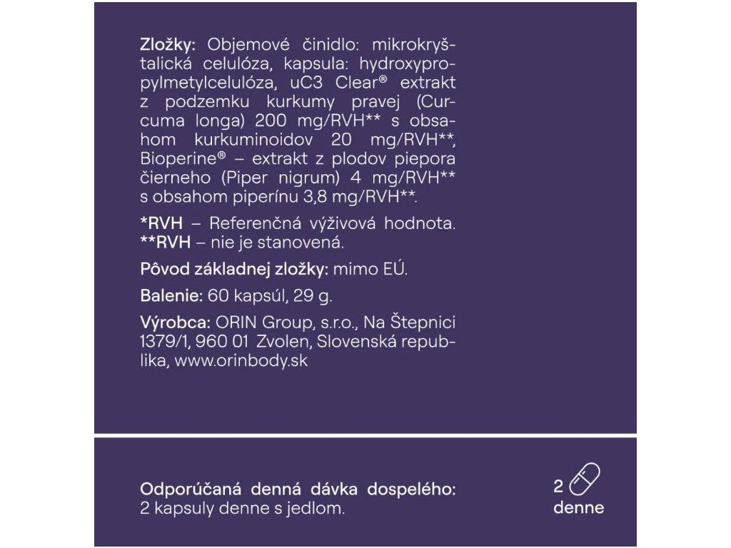 Zloženie: Objemové činidlo: mikrokryštalická celulóza, kapsula: hydroxypropylmetylcelulóza transparentná vegánska, extrakt z podzemku Kurkumy pravej (Curcuma longa) s obsahom kurkuminoidov, Bioperine® - extrakt z plodov Piepora čierneho (Piper nigrum) s obsahom piperínu