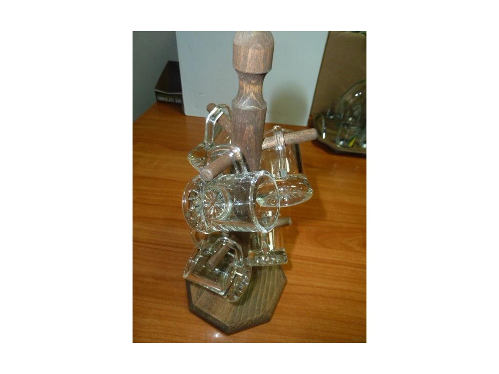 Drevený stojan so sklenenými pohárikmi vhodný ako darček.
