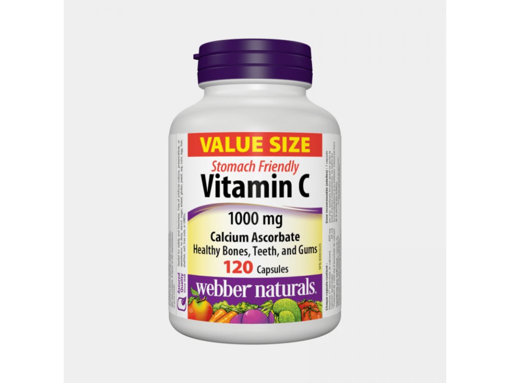 Vitamín C je pravdepodobne najznámejší pre podporu funkcie imunitného systému a môže pomôcť skrátiť trvanie príznakov nachladnutia. Je tiež životne dôležitý pre hojenie rán a celkové zdravie pokožky, spojivového tkaniva, kostí, ďasien a zubov. Každá kapsula s obsahom 1 000 mg vitamínu C ľahko stráviteľného, od spoločnosti Webber Naturals poskytuje 820 mg vitamínu C a 94 mg vápnika z askorbátu vápenatého a je ideálna pre kohokoľvek, kto hľadá vyššiu dávku ľahko stráviteľnej formy vitamínu C.